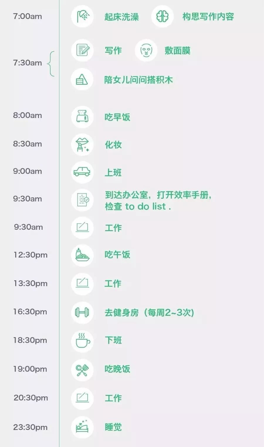 下面這張圖是印象筆記在采訪瀟灑姐王瀟時,她展示的日常作息,她出過五本書,是創(chuàng)業(yè)公司的創(chuàng)始人兼CEO,是活躍的大V,是家中的美貌妻子和溫柔媽媽,也是有好看馬甲線的健身達人,盡管做到了這么多事,她仍然每天精力充沛,做事效率超高!