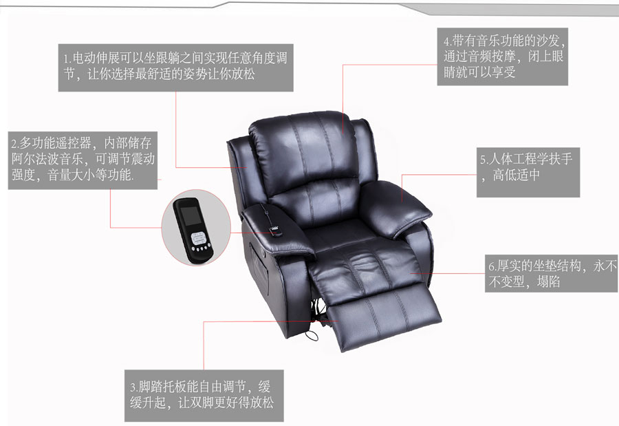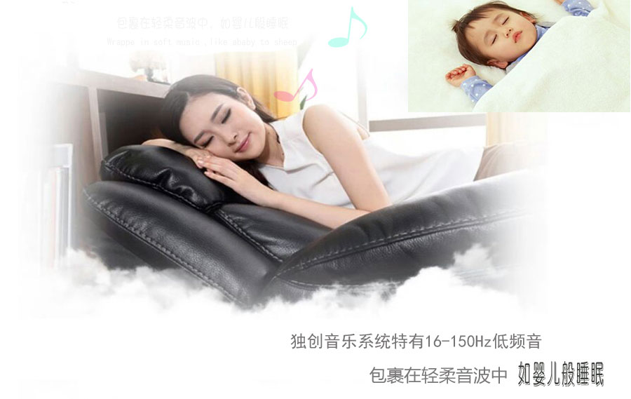 3、隨意調(diào)節(jié)——電動伸展可以坐與躺之間實(shí)現(xiàn)任意角度調(diào)節(jié),讓您選擇最舒適的姿勢進(jìn)行放松, 多方位音樂按摩身體,令您快速入睡,幫助您實(shí)現(xiàn)"完美睡眠"。